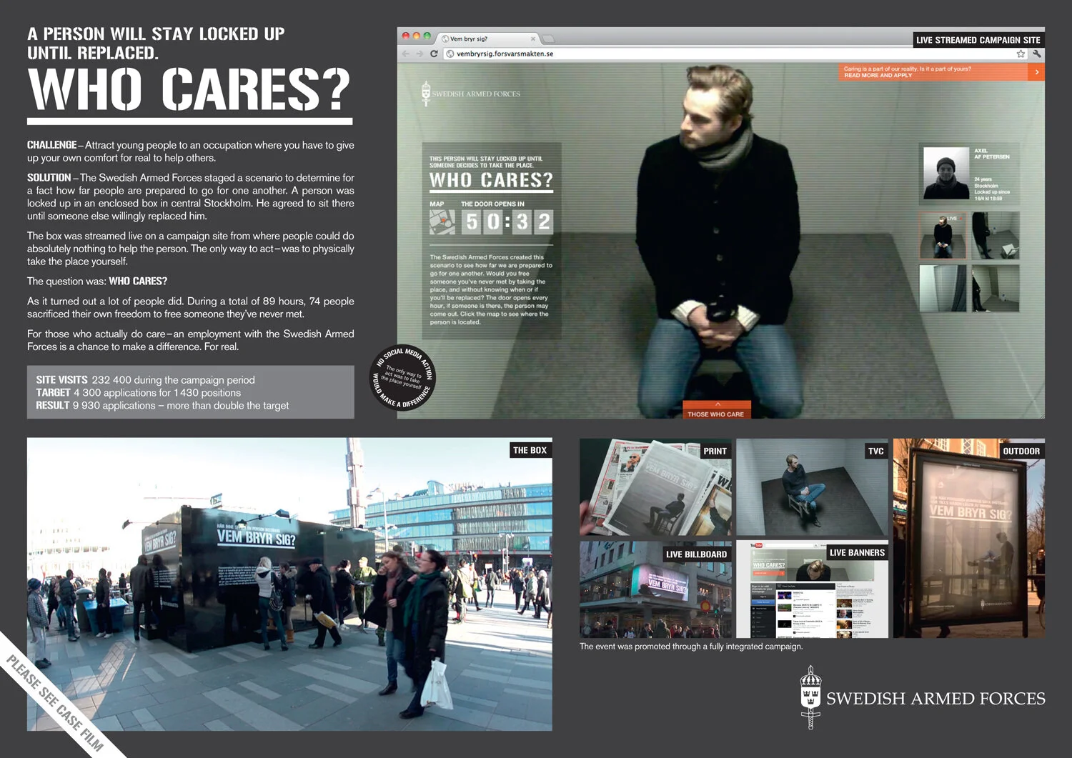 Försvarsmakten iscensatte ett scenario för att ta reda på hur långt vi egentligen är beredda att gå för varandra. En person låstes in i en box i Stockholm. Han gick med på att sitta där tills någon frivilligt tog hans plats. En gång varje timme öppnades en dörr, om någon var där fick han lämna boxen. Boxen streamades live på en kampanjsite från vilken folk inte kunde göra något för att hjälpa personen. Inga statusuppdateringar hjälpte och ingen tweet gjorde någon skillnad. Det enda sättet att hjälpa personen var att fysiskt ta platsen själv.