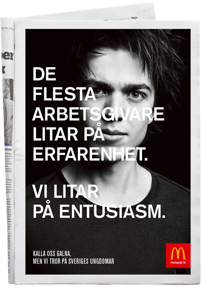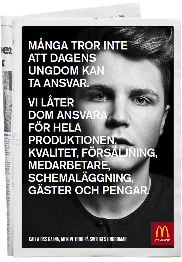 Vi ville ta allmänhetens missuppfattning att McDonald’s bara är ”ett gäng ungdomar” och vända det till en av våra största tillgångar. Genom att visa svenska ungdomars förmåga och vår tro på dem lyckades vi förändra synen på McDonald’s som arbetsgivare, både extern och internt.